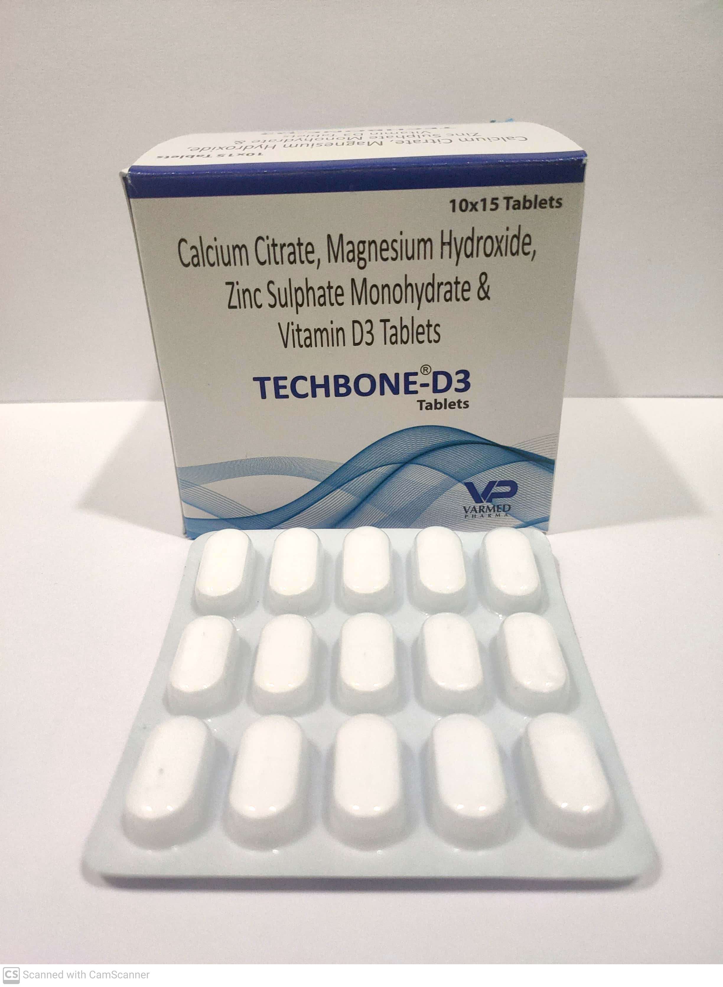 Techbone-D3 Tablet contains Vitamin D3 (Cholecalciferol) essential for bone strength, calcium absorption, immune health, and muscle support. It is beneficial in vitamin D deficiency, weak bones, fatigue, osteopenia, and general debility. With increasing vitamin D deficiency in India, this product sees high ongoing demand. Marketed by Varmed Pharma Pvt Ltd – Best PCD Franchise Company.